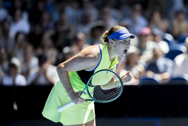 新华社照片,墨尔本(澳大利亚),2026年1月26日 1月26日,阿尼西莫娃在比赛中庆祝得分。 当地时间1月26日,在墨尔本进行的2026年澳大利亚网球公开赛女单第四轮比赛中,中国选手王欣瑜0比2不敌美国选手阿尼西莫娃,无缘八强。 新华社发(胡泾辰摄)